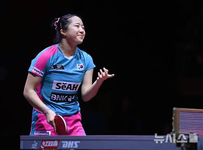 [도하(카타르)=뉴시스] 사진공동취재단 = 신유빈이 22일(현지 시간) 카타르 도하 루사일 아레나에서 열린 2025 국제탁구연맹(ITTF) 세계선수권대회 여자단식 16강 중국 쑨잉사와 경기에서 실점 후 아쉬워 하고 있다. 2025.05.23. photo@newsis.com