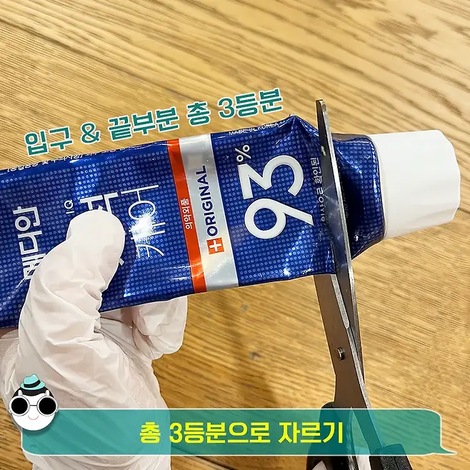 치약을 입구 쪽에서 한번, 끝부분에서 한번 잘라주어 총 3등분이 나오도록 해줄 거예요.