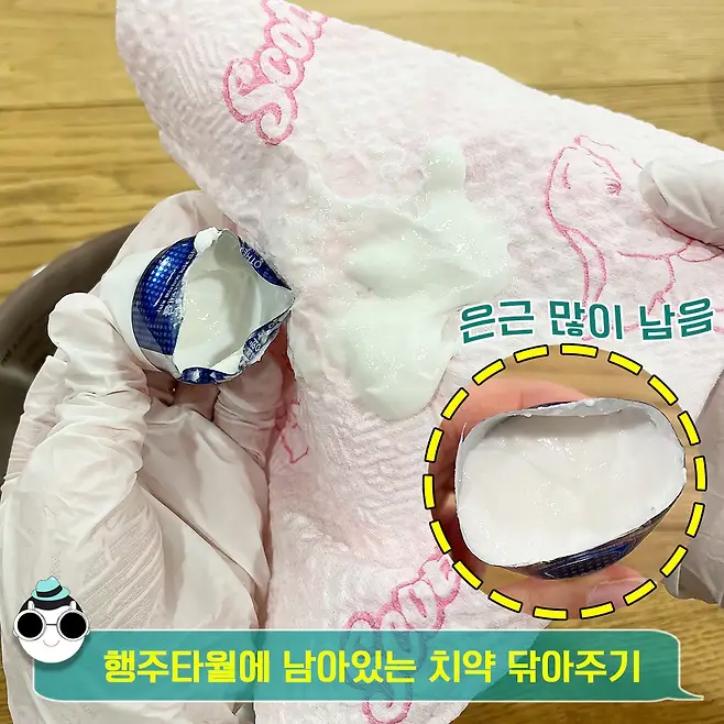 STEP 2. 행주타월로 남아있는 치약 닦아주기