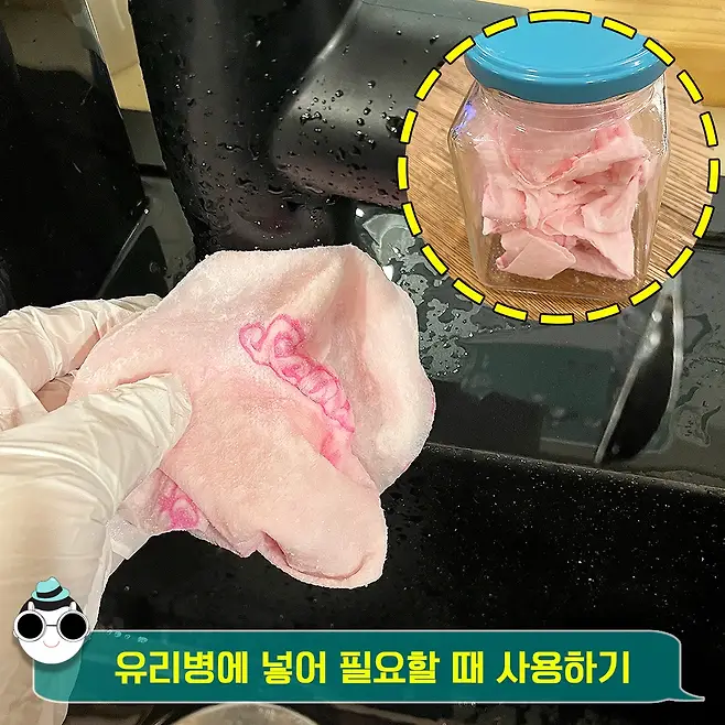 는 청소티슈를 만들어 놓고 한 번에 다 쓰지 않고 필요할 때마다 꺼내서 쓰기 때문에 유리병에 넣어서 보관해 줬어요!