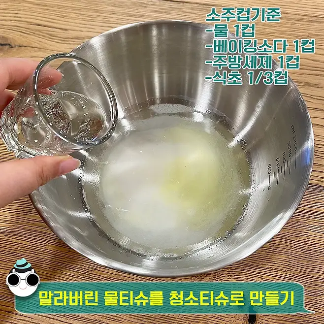 베이킹소다가 물에 잘 녹았다면 주방 세제를 넣고 섞어주세요. 벌써부터 만능 청소티슈가 될 것 같지 않나요?ㅎㅎ