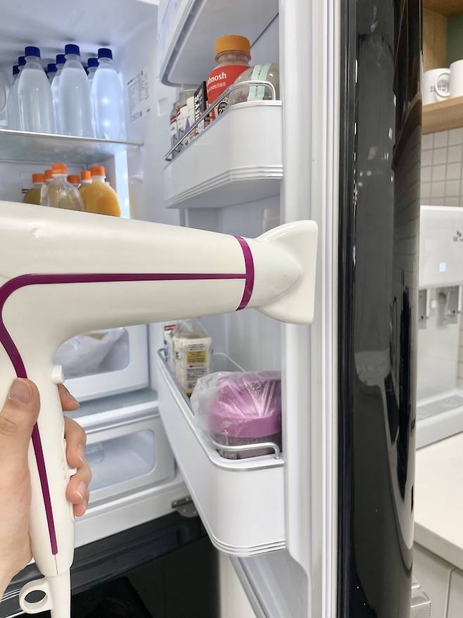 이렇게 느슨해진 도어 패킹은, 집에서도 간단하게 복원시킬 수 있답니다. 가정용 헤어드라이어를 이용해 냉장고 삼면의 패킹 부분에 뜨거운 열풍을 쐬어 주면 끝!
