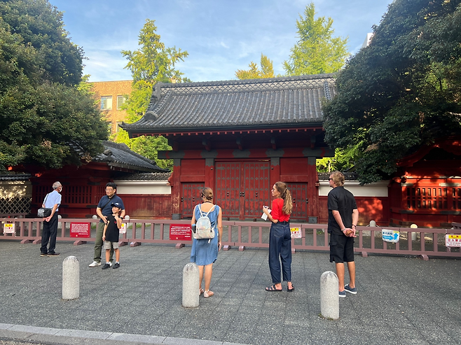 역에서 더 가까운 후문 두 군데를 지나면 도쿄대의 상징인 ‘아카몬(붉은 문)’이 보인다. 정문보다 더 유명한 문이 바로 이곳인데, 몇 년 전까지만 해도 이곳으로 학생들이 드나들었지만 현재는 지반 검사 겸 보존을 위해 폐쇄한 상태라고 한다. 초록빛이 무성한 도쿄대 캠퍼스에서 이 문이 유일하게 쨍한 붉은 색을 띠고 있는 만큼, 아카몬은 강한 존재감을 드러내고 있다.
