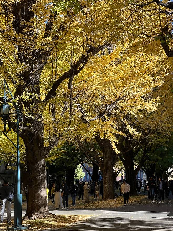 정문으로 들어서면 잎이 무성한 은행나무들이 펼쳐지고, 그 사이로 길이 쭉 뻗어 있다. 도쿄대의 마크가 노란색과 파란색의 은행나무잎이 겹쳐 있는 형상인 만큼 이 은행나무는 도쿄대의 상징이라고 할 수 있다. 여름에는 이 나무들이 아름다운 초록의 향연을 보여주다가 가을을 맞이해 리즈 시절을 맞는다. 샛노랗게 물든 나무들이 캠퍼스에 운치를 더해주고, 학생들보다는 오히려 관광객들이 더 많이 모여들어 이 풍경을 만끽한다.