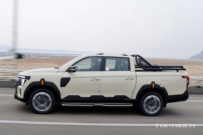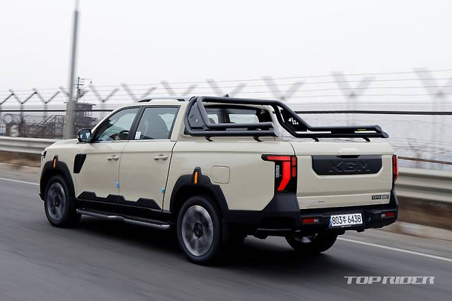 측면부는 프론트와 리어 펜더로 이어지는 역동적인 사이드 캐릭터 라인과 볼륨감으로 다이내믹한 이미지를 완성했다. 측면 캐릭터 라인의 시작점에 배치된 펜더&도어 가니쉬는 차체의 존재감을 더욱 부각시키며, 휠 아치 가니쉬는 산의 정상을 형상화한 리플렉터를 적용해 KGM 픽업만의 시그니처 디자인을 연출했다. 여기에 블랙 컬러의 아웃사이드 미러가 강인한 이미지를 배가한다.