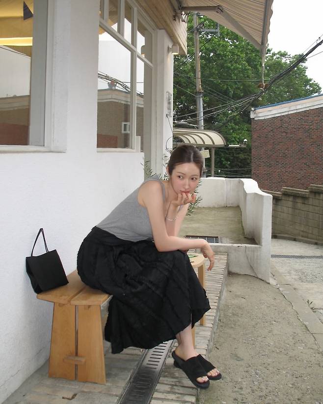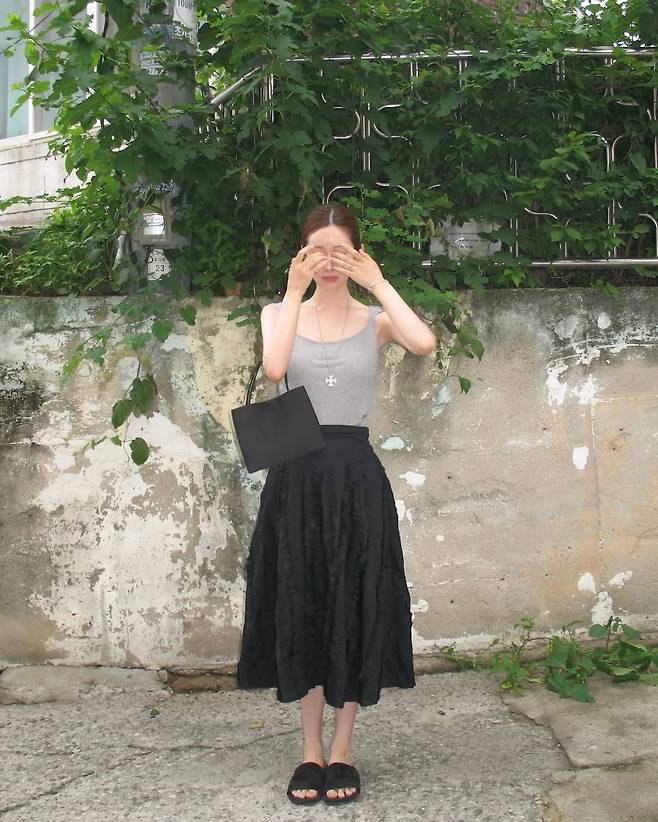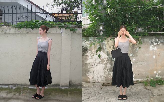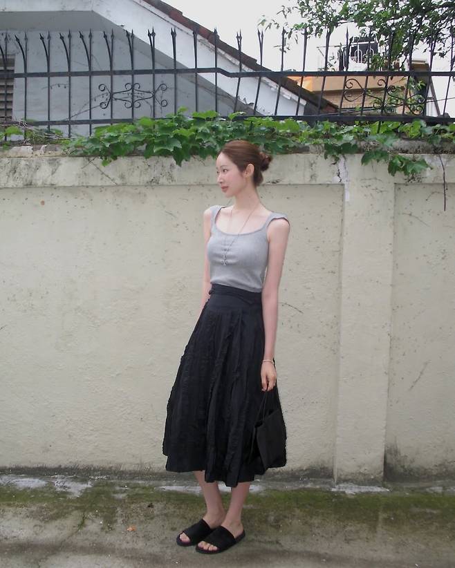 회색 민소매 탑에 블랙 플레어 스커트를 매치해 깔끔하면서도 안정감 있는 실루엣을 연출했다.