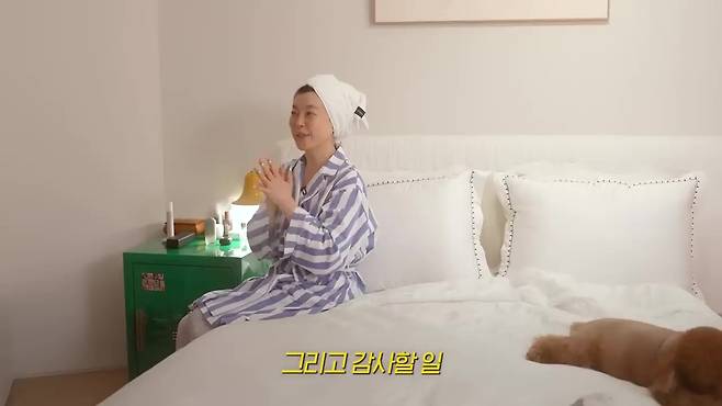 나이트 루틴의 마무리는 아로마 향을 맡으며 하루에 있었던 일을 생각하고 감사하는 것으로 끝이 났다. 하루에 감사한 일을 생각하면 마음이 편안해진다는 최화정은 반려견과 함께 잠자리에 들었다.
