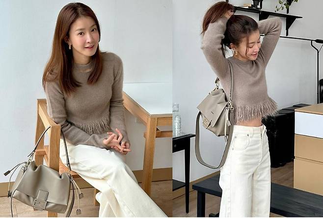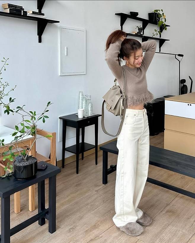 크롭 길이의 프린지 디테일 니트와 아이보리 컬러의 하이웨이스트 팬츠를 매치한 이시영은 여리여리한 실루엣을 강조했습니다.