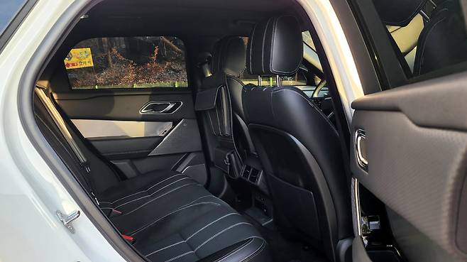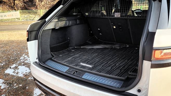 상급 레인지로버 모델들과 차이가 와닿는 부분은 뒷좌석이다. 레그룸은 일반적인 중형 SUV보다 살짝 좁은 느낌인데 전폭은 넉넉했다. 헤드룸은 적당한 공간이고 쿠페형 SUV와 비교한다면 훨씬 편안하다. 편의장비는 에어벤트와 열선시트, 암레스트가 있다. 2열 공간이 생각보다 좁다고 느껴진 대신 트렁크 공간이 굉장히 넓어서 놀랐다. 아무래도 늘씬한 비율을 위해 리어 오버행을 연장한 디자인이라서 트렁크 공간 면적이 확장된 것 같다. 옵션으로 제스처 컨트롤을 추가하거나 파티션을 부착할 수도 있다.