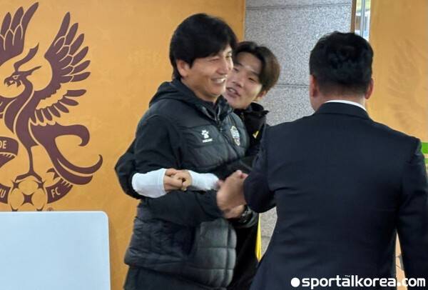 박태준은 인터뷰를 끝낸 후 누군가를 향해 달려가 꼭 안겼다. 다름 아닌 김천 정정용 감독이었다. 치열한 맞대결에 앞서 애써 등을 돌리던 정정용 감독도 제자의 애교에 이내 품을 내줬다. 두 사람은 밝게 웃으며 훈훈한 대화 몇 마디를 주고받았다.