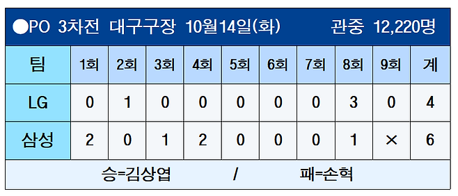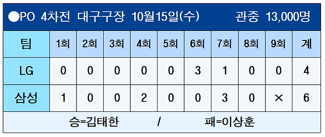 4년 전에는 1~2차전(잠실)에서 2연패를 한 뒤 3~4차전(대구)에서 2연승을 올렸지만 잠실 최종 5차전에서 패하면서 한국시리즈 진출에 실패했다.