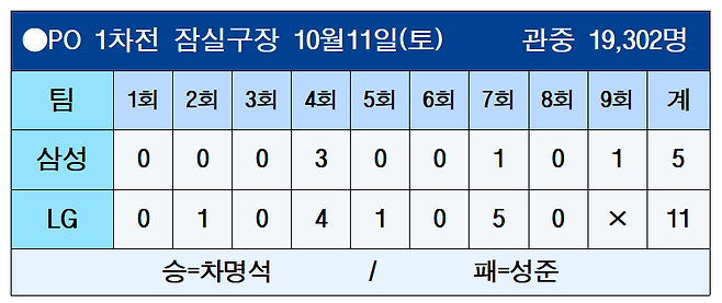 플레이오프 1차전부터 홈런 5방과 16점이 터지는 난타전으로 전개됐다. LG 김용수(4.1이닝 3실점)와 삼성 성준(4.2이닝 5실점) 두 선발투수가 예상보다 일찍 강판한 가운데 첫판부터 불펜싸움이 펼쳐졌다.