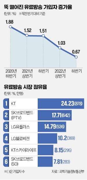 22일 과학기술정보통신부에 따르면 지난해 하반기 IPTV·종합유선방송(SO)·위성방송 등 유료 방송 가입자 수는 3624만8397명이다. 지난해 상반기보다 가입자가 0.67% 증가했다. 직전 반기 대비 유료 방송 가입자 수 증가율이 0%대에 그친 것은 이번이 처음이다.