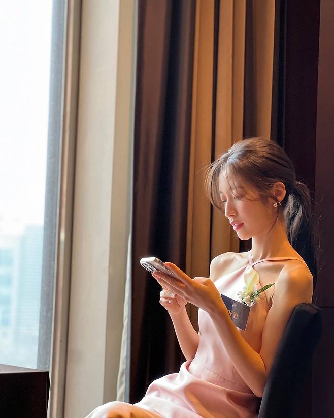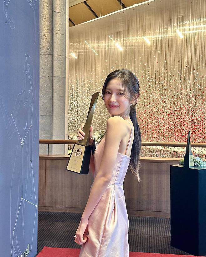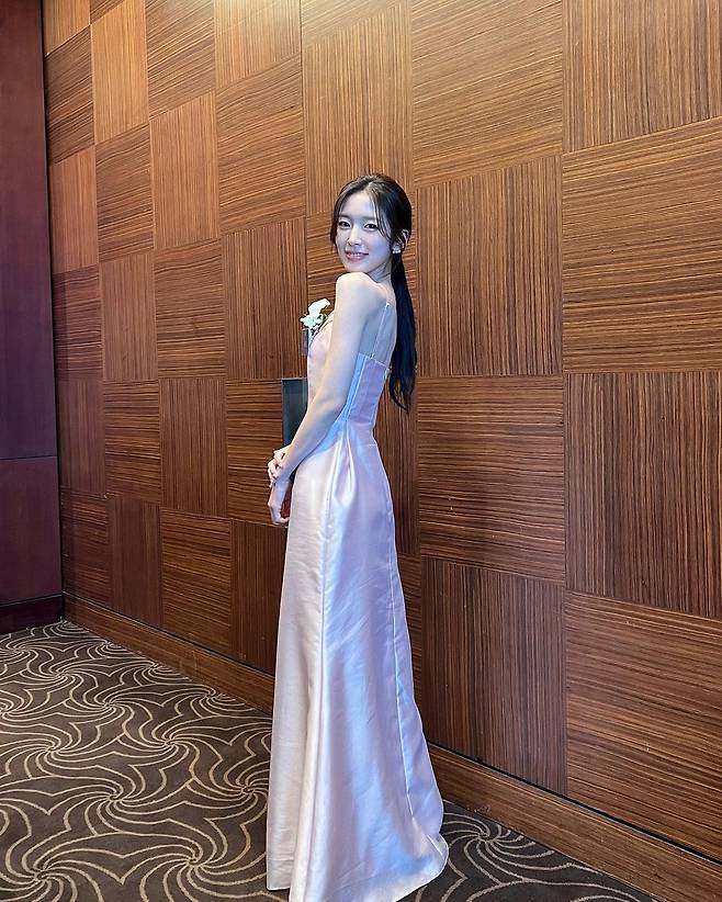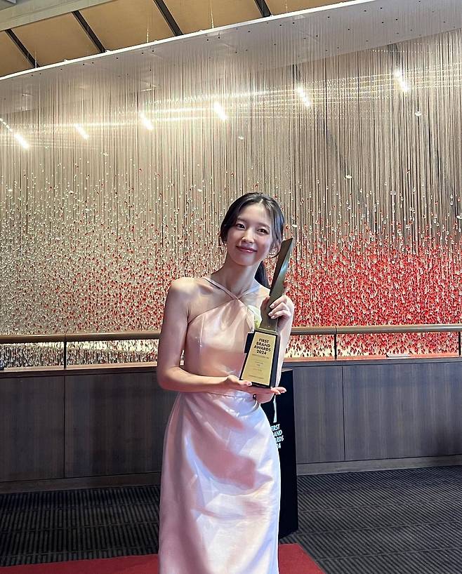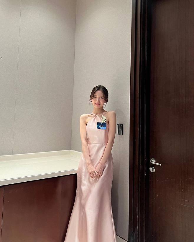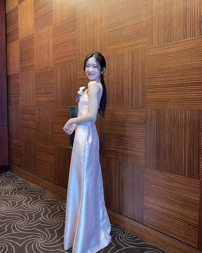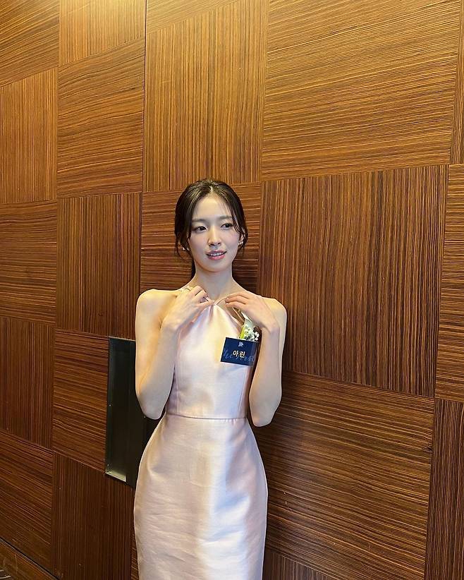 사진 속 아린은 핑크빛 실크 소재의 홀터넥 드레스를 입고 여신 비주얼을 뽐내며 수상 인증샷을 찍었다.