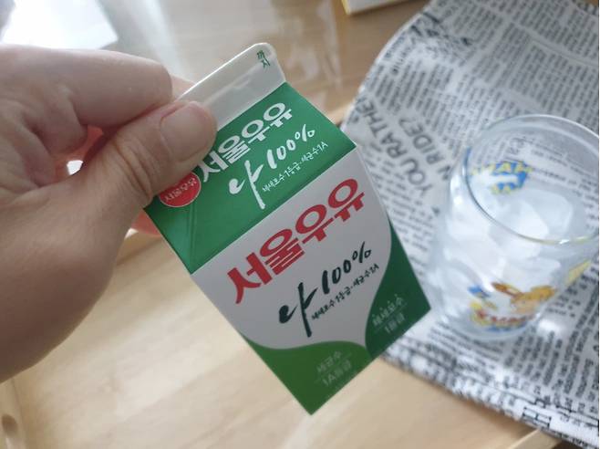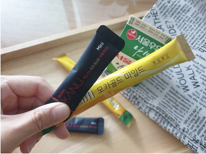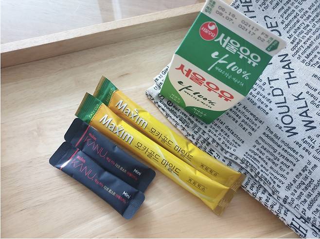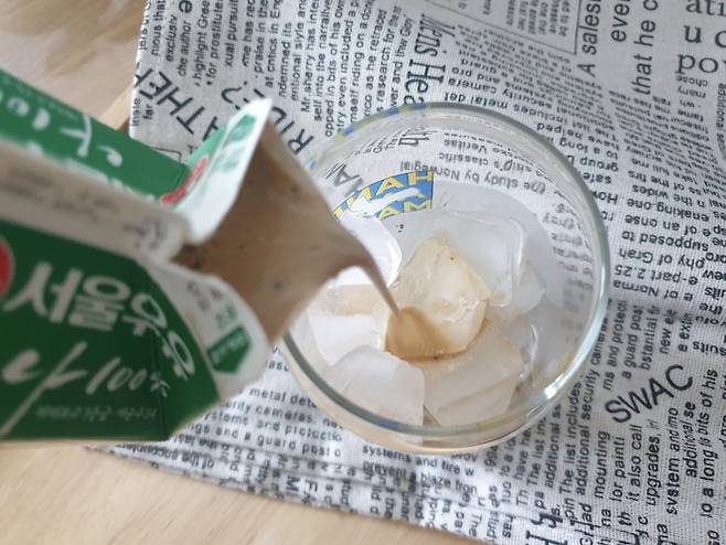 우유 200ml, 믹스커피 2봉지, 카누 2봉지, 얼음