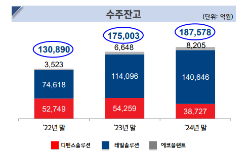 지난 2023년 기준 현대로템 레일솔루션 부문의 수주잔고는 11조4096억원으로 2022년 7조4618억원보다 보다 53% 증가했다. 2024년에는 수주잔고가 14조646억원으로 늘었다.