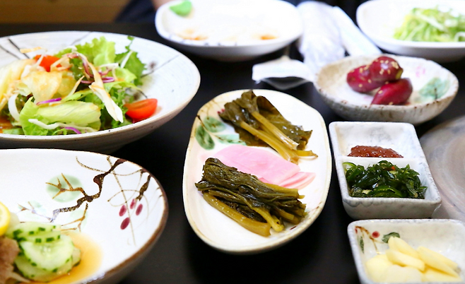 ▶ 반찬류는 백김치, 물김치, 열무김치, 겉절이 등 직접 담근 김치와 단호박샐러드, 파무침, 생강채 등으로 구성되어 있습니다.