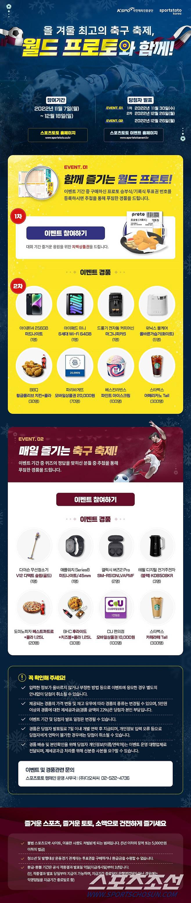 '함께 즐기는 월드 프로토!'는 현재 2차 이벤트만 참여가 가능하며, 12월 18일(일)까지 구매한 프로토 기록식 혹은 승부식의 투표권 번호를 등록하면, 추첨을 통해 아이폰14 256G, 아이패드 미니 6세대, 드롱기 전자동 커피머신, 위닉스 올케어 올바른가습기, BBQ황금올리브 치킨세트 등을 증정한다.