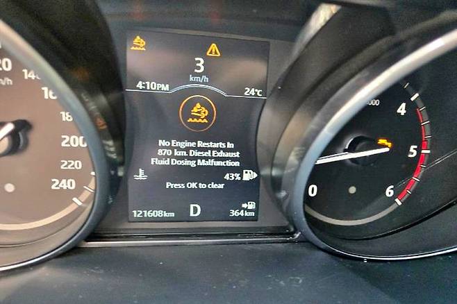 문제는 여기서 끝나지 않는다. 차량을 수리받은 바로 다음 날, 이상 증상이 다시 나타났다. 다시 엔진 경고등이 점등되었고 요소수 관련 경고 메시지까지 함께 떴다. 수리 완료 후 하루밖에 지나지 않은 시점에서 발생한 문제인 만큼, 정비 품질에 대한 의문이 제기될 수밖에 없는 상황이다.