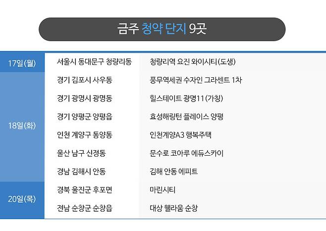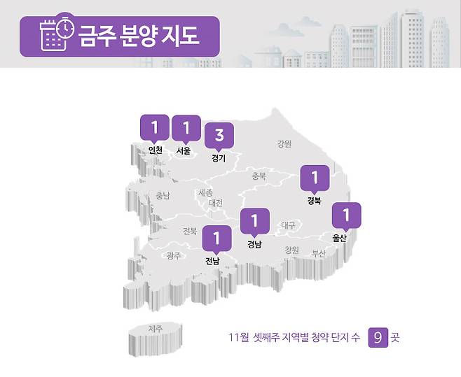 부동산인포에 따르면 11월 3주차엔 전국 9곳에서 8,082가구가 분양할 예정입니다. 권역별로는 수도권이 5곳, 지방 4곳 등입니다.