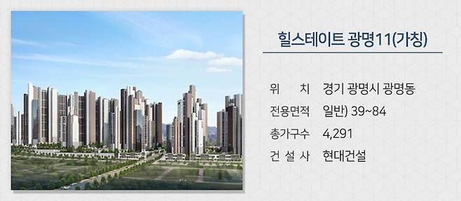 현대건설이 경기 광명시 광명동, 철산동에 위치하는 '힐스테이트 광명11(가칭)'을 분양합니다. 단지는 광명11R구역을 재개발한 단지로 총 4,291가구의 매머드급 규모를 자랑합니다. 지하철 7호선 광명사거리역 초역세권 단지며 철산역도 도보권에 있어 서울로 빠르게 이동할 수 있습니다. 추후 7호선 부천종합운동장역에는 GTX-B노선(예정)이 연결 돼 교통여건은 더욱 좋아질 전망입니다. 광명전통시장, 광명시청, 광명시민운동장 등이 가깝고, 광명남초가 단지와 접해 있는 초품아 단지입니다.