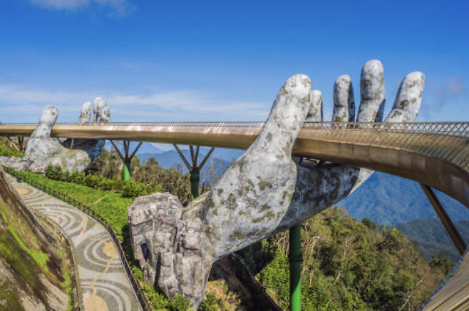 바나힐(Ba Na Hills): 세계에서 가장 긴 케이블카를 타고 산 정상에 오르면 시원한 공기와 함께 화려한 골든 브릿지가 반겨줍니다. 걷기 힘들어하시는 어르신들도 케이블카 안에서 절경을 감상할 수 있어 만족도가 높습니다.