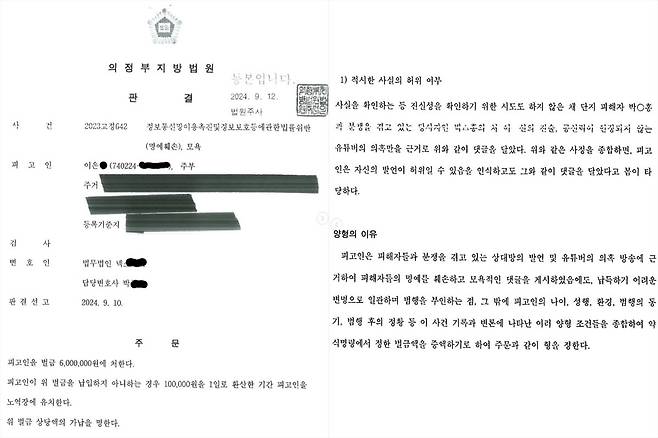 이어 "검찰에서 정보통신망 이용촉진 및 정보보호법 위반 혐의로 약식 기소되어 400만 원의 벌금형이 선고됐습니다. 하지만 형수 친구는 이에 불복해 정식 재판까지 진행되었고, 결국 벌금이 600만 원으로 증액되었습니다"라고 덧붙였다.