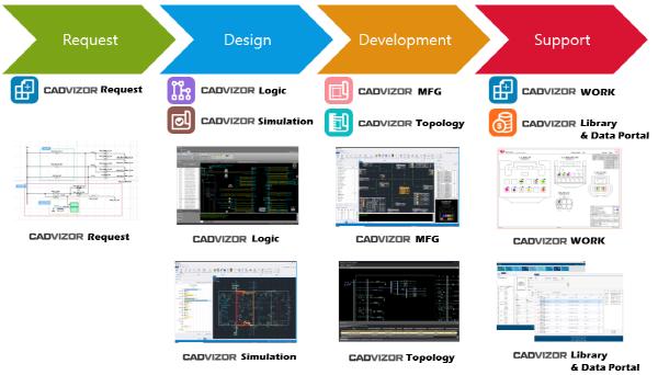 CADvizor는 전장 설계 CAD 솔루션으로 현재 국내외 자동차, 인공위성, 항공기 업계에서 사용 중이며, CADvizor는 전기설계자들이 설계도면을 제작하는 데 사용된다. 주요 모듈은 △상세설계 모듈 LOGIC △생산도면 설계 모듈 MFG △ 설계 요구사항 반영 모듈 REQUEST △ 자동 작업지시 모듈 WORK △ 매주 업데이트되는 200만 개 라이브러리 모듈 DATA PORTAL △ 전기적 시뮬레이션 모듈 SIMULATION이 있다.