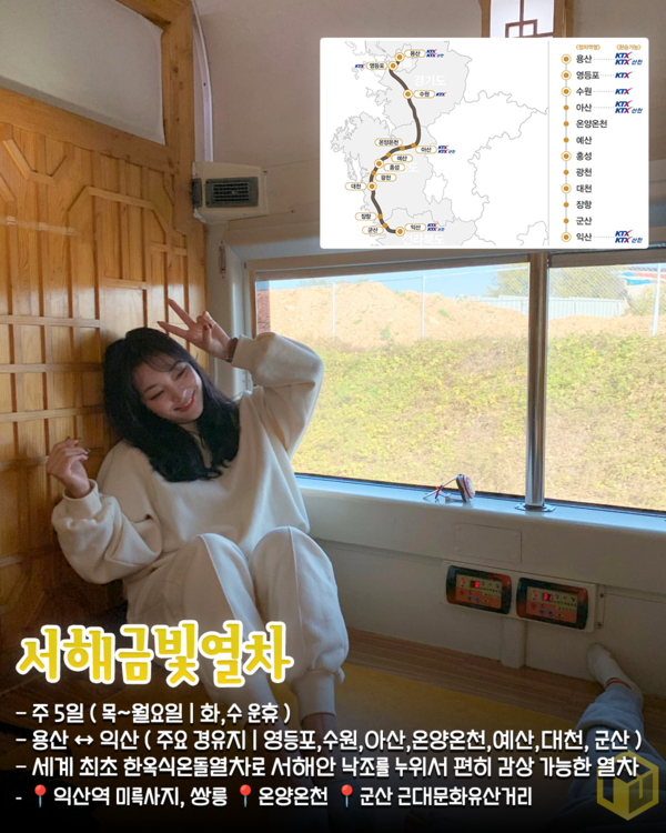 세계 최초로 한옥식 온돌마루 좌석을 갖춘 서해금빛열차는 온돌마루실은 뜨끈한 온돌로 특히 겨울철 인기있는 관광열차입니다.