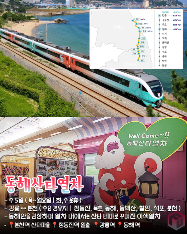 또 분천역 하차하여 산타마을을 방문하기면 12월 연말 느낌이 가득해 아이들과 함께 방문하시는 걸 추천드립니다. 또 해돋이 명소인 정동진역도 정차해 신년 여행으로 떠나기도 좋습니다.