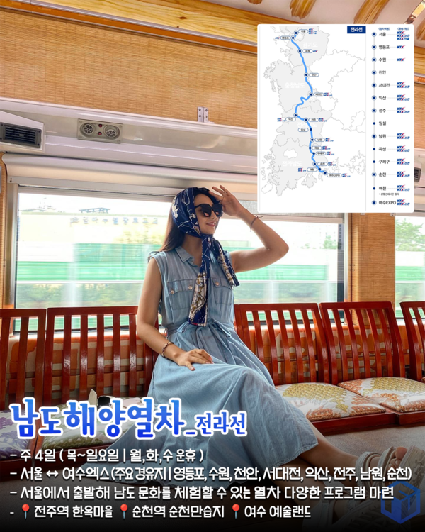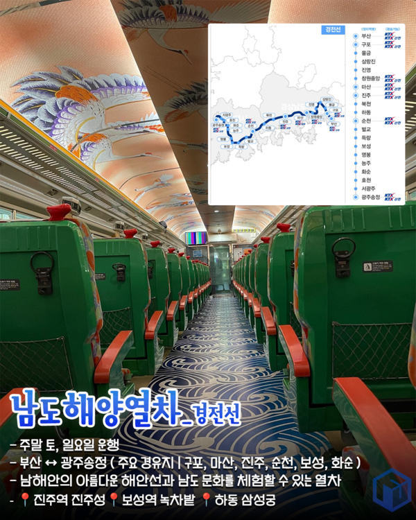 남도해양열차는 전라선과 경전선 노선이 있는 관광열차로 남해안의 아름다운 해안선과 남도 문화를 체험할 수 있는 열차로, 각 지역의 특산품과 문화를 즐길 수 있는 프로그램이 마련되어 있는 열차입니다.