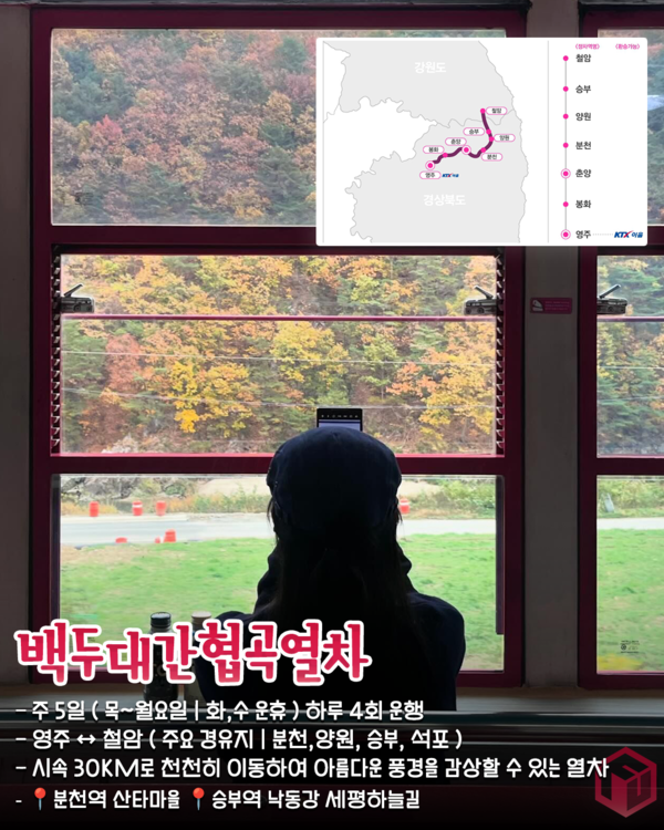 경상북도 영주에서 강원도 철암까지 백두대간의 협곡을 따라 운행하는 백두대간 협곡열차는 큰 창문과 시속 30km로 천천히 이동하여 협곡의 아름다운 풍경을 찬찬히 음미 할 수 있는 열차입니다.