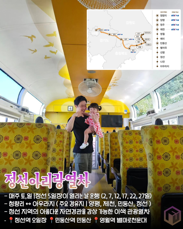 정선 지역의 아름다운 자연경관과 아리랑 문화를 체험할 수 있는 정선아리랑열차입니다. 강원도 정선, 민둥산역, 영월역에 정차해 강원도의 아름다운 자연을 만끽하러 가기에 좋은 열차입니다.