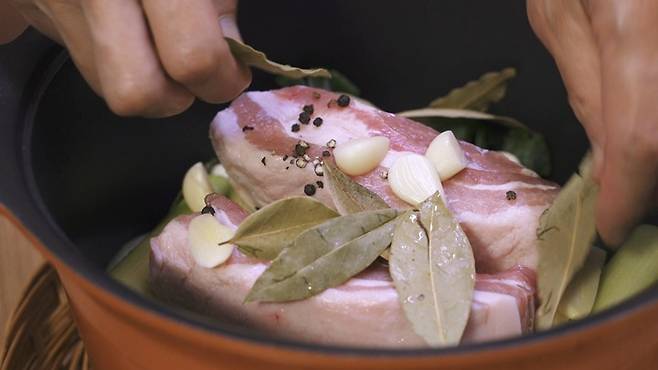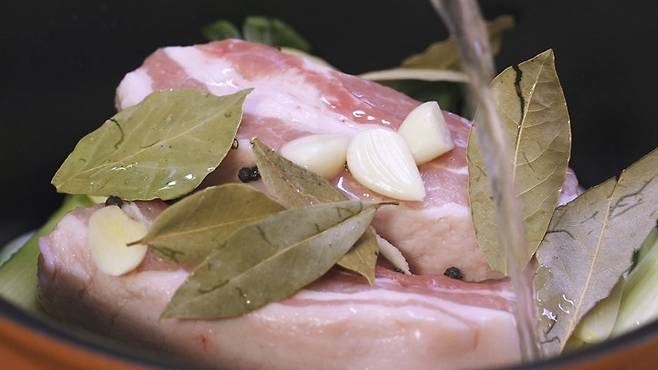 바로 월계수 잎을 넣어 주는 것이에요. 월계수 잎은 돼지 누린내를 잡는데 탁월하답니다. 가급적이면 월계수잎을 꼭 구해서 함께 넣어주면 누린내, 잡내 없이 맛있게 수육을 즐길 수 있어 좋아요.