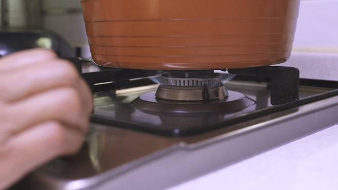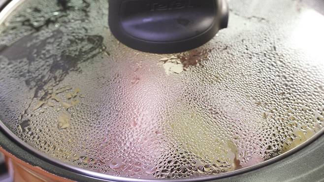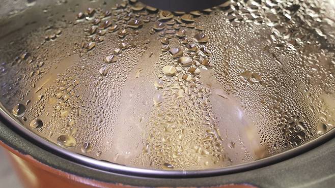 이제 뚜껑을 덮고 '강불'에서 처음 5분간 끓여 주세요. 뚜껑으로 수분이 점점 차오르는 것이 보이면 '약불'로 줄여 주는 것이 좋아요.