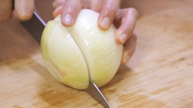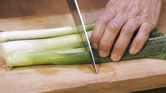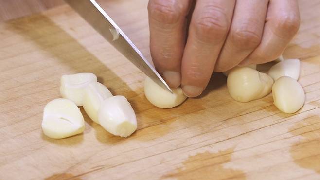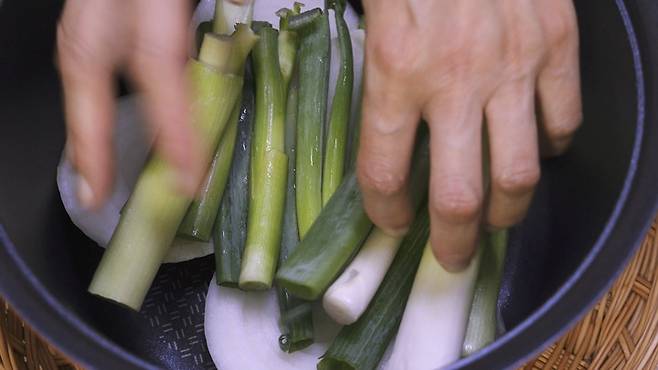 마늘은 절반으로 자르고, 대파도 절반으로, 양파는 넓적하게 썰어 주세요.