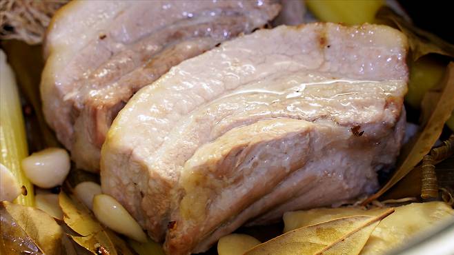 물 없이 돼지고기를 삶아내 육즙이 그대로 살아 있어 더욱 맛있어요. 그리고 다른 야채의 향이 함께 돼지고기에 배어 있어 더욱 맛있답니다.