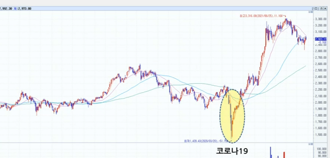 나스닥 차트를 보면 계속해서 계단식으로 상승세를 보이다 코로나 때 하락하는 모양새를 보인다. 하지만 이내 다시 회복해 꾸준히 상승곡선을 그리는 걸 볼 수 있다.
