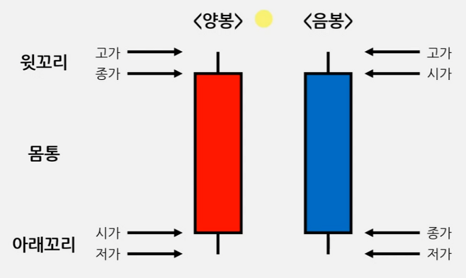 음봉은 양봉과 다르게 시가와 종가가 반대로 되어 있다. 처음 장을 시작했을 때보다 낮은 주가로 장을 마감했다는 뜻이다.