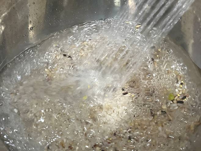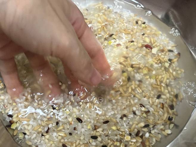 두 번째 세척부터는 손으로 가볍게 헹궈서 여러 번 세척합니다. 그러면 쌀알 표면에 남아 있던 전분과 불순물이 점차 제거되면서 밥을 지었을 때 혈당 상승 속도가 완만해지는 효과가 있습니다.