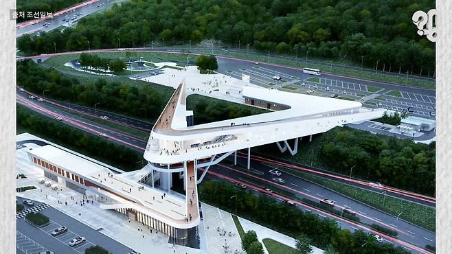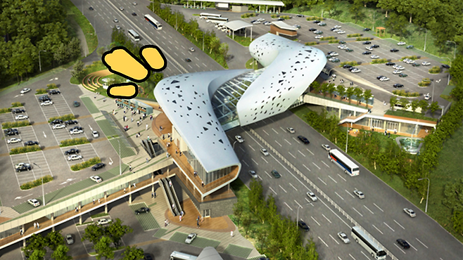 "휴게소를 설치하려면 기본적으로 주차장이 있어야 하잖아요? 그런데 주차장을 설치하고 나니까 건물 놓을 자리가 없는 거죠 ㅎㅎ 그러다 보니까 건물을 좀 창의적으로 공중에 띄우자!"