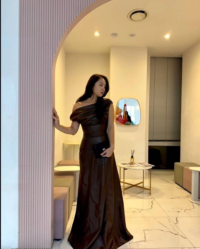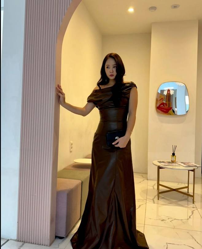 소유는 딱 붙는 핏의 브라운 가죽 드레스를 착용해 고급스럽고 우아한 분위기를 강조했습니다.