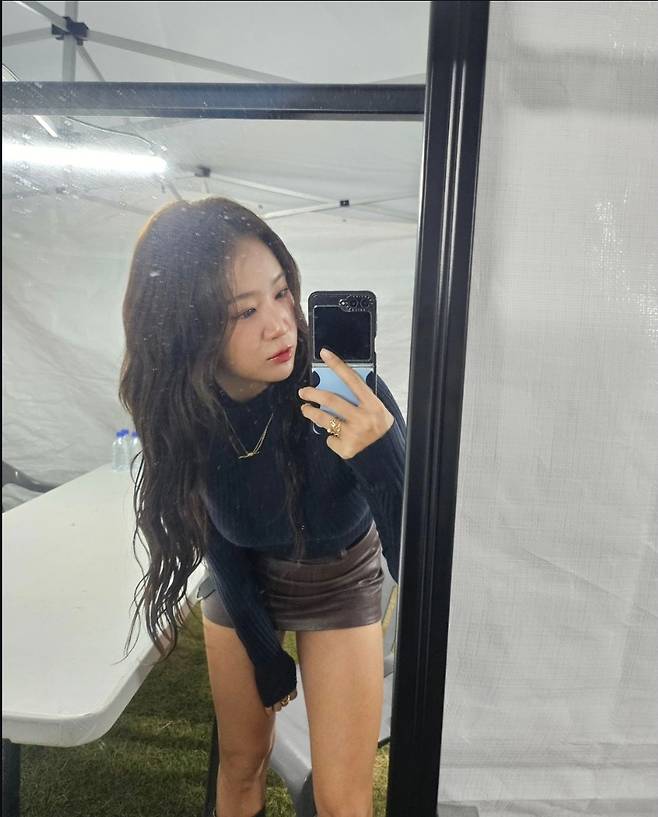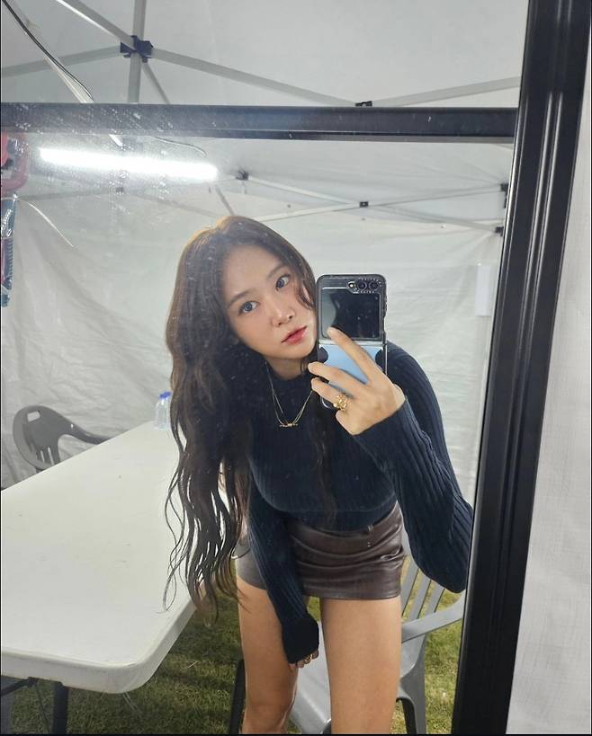 또 다른 사진에서 소유는 블랙 긴팔 니트와 브라운 레더 미니스커트를 매치해 시크하면서도 페미닌한 이미지를 돋보였습니다.