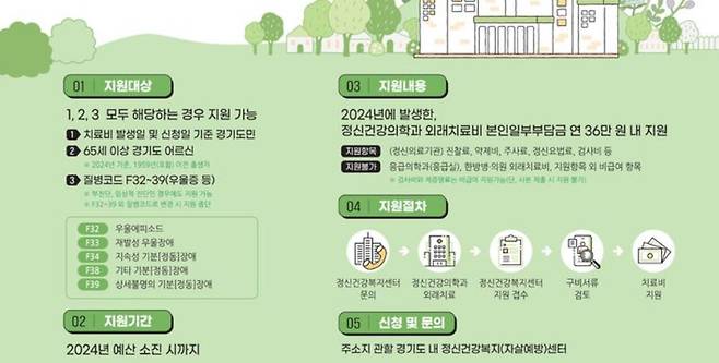 경기도에서는 우울증을 앓고 있는 노년층을 적극 지원하기 위해 소득 기준, 병원 등록 여부를 따지지 않고 36만원을 지원하고 있다.