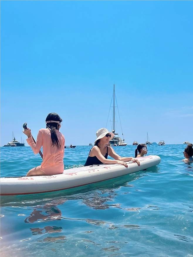 강렬한 햇살 아래에서도 내추럴하게 묶은 머리와 오버사이즈 선글라스로 세련된 리조트 룩을 연출했고, 해변에서도 패들보드에 앉아 자연스럽게 포즈를 취하며 여유로움을 드러냈습니다.