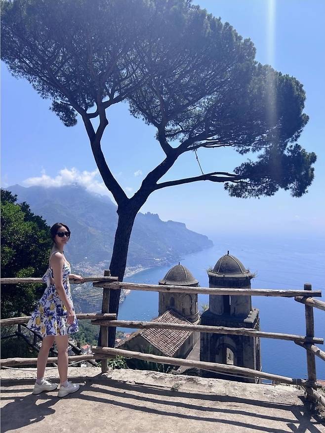 플로럴 미니 드레스를 입고 지중해를 배경으로 선 모습은 마치 한 장의 영화 포스터 같았습니다.