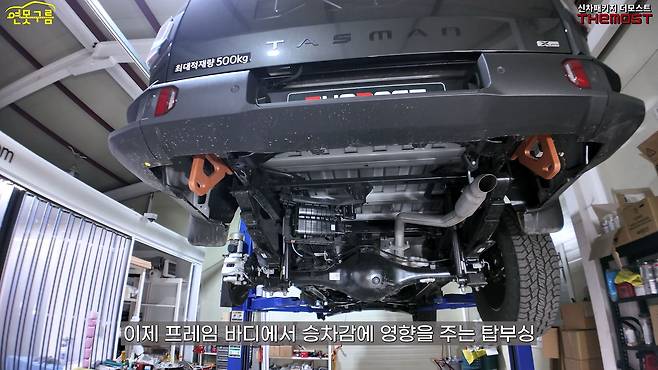 바디온프레임 차량의 승차감에 큰 영향을 미치는 프레임과 차체 연결 부위의 고무 부싱(탑 부싱) 역시 기존 모하비 대비 개선되었다는 점이 언급됐다. 이는 쌍용차 등에서 승차감 개선을 위해 애프터마켓 부품으로 교체하는 경우가 많았던 부품으로, 타스만은 순정 상태로도 상당한 개선이 이루어졌음을 보여준다.