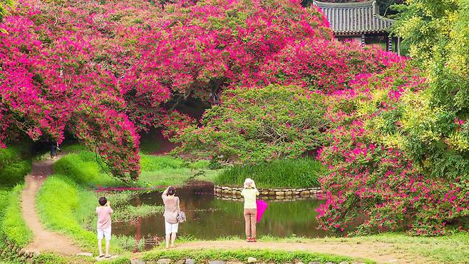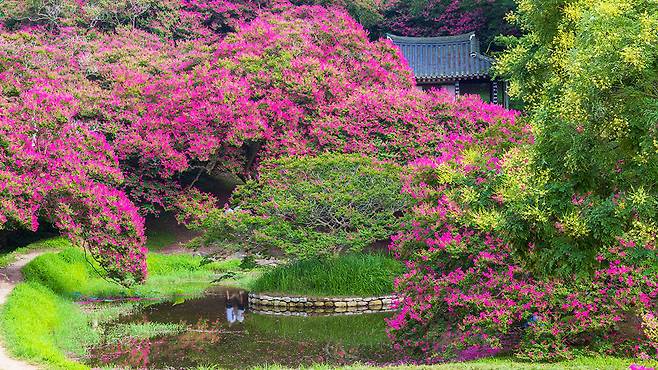 눈앞에 분홍빛 물결이 흐른다. 정자와 연못, 그리고 꽃이 피어나는 한적한 산자락의 풍경은 그 자체로 한 폭의 수묵화를 떠올리게 한다.