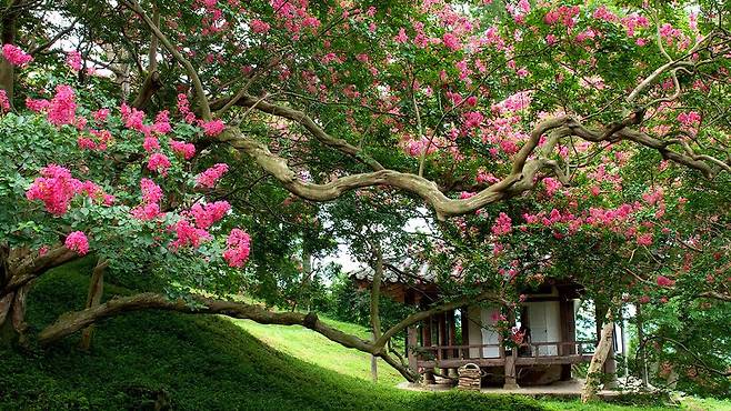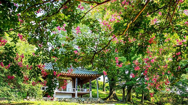 정자 앞뒤로 배치된 네모난 연못과 그 주변을 병풍처럼 감싼 백일홍(배롱나무)은 여름의 시작을 알리듯 7월 중순부터 8월까지 분홍빛 꽃잎을 가득 피운다.