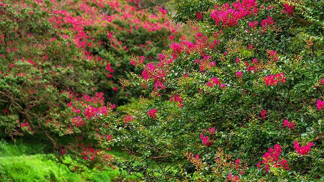 이 배롱나무들 중에는 무려 300년을 버텨온 고목도 있어, 그 존재만으로도 깊은 울림을 준다. 꽃이 한잎씩 떨어질 때마다 연못 위에 물결처럼 퍼지고, 바람에 일렁이는 수면은 보는 이의 마음까지 차분하게 만든다.